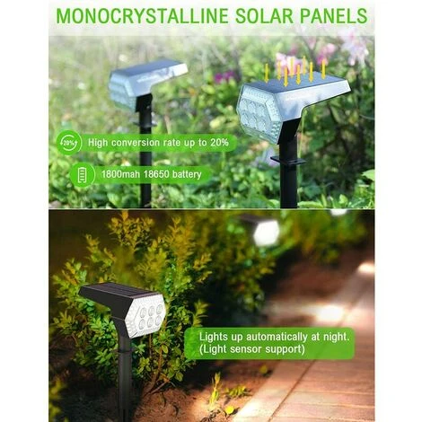 automatiquement la lumière ambiante et passer automatiquement du mode d =’économie d =’énergie au mode d =’éclairage dans un environnement sombre. (Travaillant du crépuscule à l =’aube) [2 en 1 Spot / Applique] Collez dans le sol avec des piquets / Montez sur le mur avec les vis incluses. Optimal pour patio, porche, chemin, terrasse, piscine, cour, jardin, garage, allée, allée, etc. [IP65 étanche et durable] Ces lampes solaires de paysage sont faites de matériau ABS durable et à fort impact, même les jours de pluie, elles peuvent survivre. En outre, la résistance à haute température, la résistance au gel et l =’anti-corrosion permettent