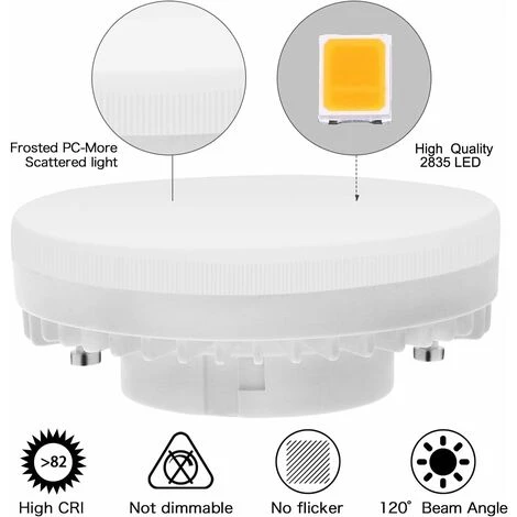 Eclairage LED GX53 de haute qualité : 88 % d’économie d’énergie ! L’ampoule LED GX53 7 W est un remplacement idéal pour une ampoule halogène de 35 à 50 watts ou une CFL (ampoule fluorescente compacte) qui ne fait que 7 W. REMARQUE : cette ampoule gx53 n’est pas dimmable.