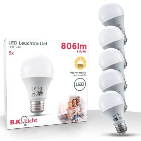 B.K.Licht lot de 5 ampoules LED E27 9W 230V, lumière blanche chaude de 2700K, 806 Lumen, équivaut ampoule halogène 75W, forme ronde