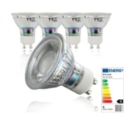 LOT DE 5 – ces ampoules LED au culot GU10 sont vendues en lot pratique de 5 ampoules, 5 Watt et 400 Lumen par ampoule, équivalant 50 Watt halogène, lumière blanche chaude de 3000 Kelvin.