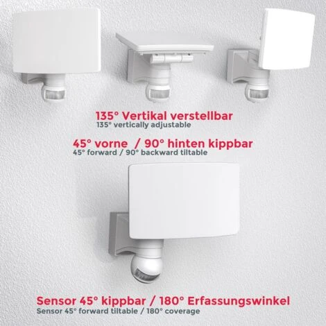- Ces appliques murales extérieures disposent d’un projecteur inclinable (vers l’avant de 45 degrés, verticalement de 140 degrés) et d’un panneau LED basculant (90 degrés vers l’arrière), qui consomme en outre peu d’énergie (20 W).