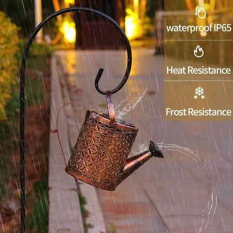 Les lampes de jardin solaires en métal de haute qualité sont recouvert solar paneles d’un revêtement antirouille sur la surface, qui résiste à la corrosion, au froid, au gel, à l’exposition et n’a pas peur de vent, pluie et neige. Vent et pluie, fonction anti-exposition. Notre arrosoir solaire avec guirlandes lumineuses convient à toute utilisation extérieure en tant que décoration d’éclairage.