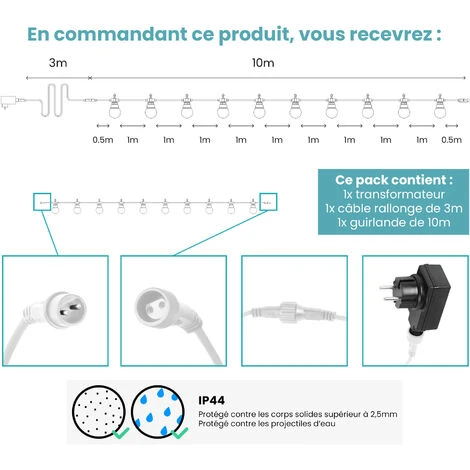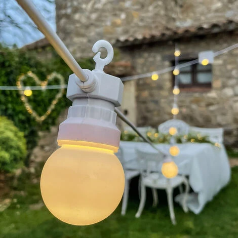 Vous pouvez utiliser la guirlande guinguette 10m blanche câble blanc seule ou l’agrandir en la raccordant à des compléments de guirlande guinguette Skylantern ! Ainsi, vous pourrez obtenir une guirlande guinguette jusqu’a 50 mètres en ajoutant 4 compléments. Pour brancher les compléments, il suffit tout d’abord de retirer le bouchon présent sur l’embout de la guirlande guinguette en le dévissant dans le sens inverse des aiguilles d’une montre. Des corchets sont présents sur le dessus de chaque bulbes pour vous aider à installer facilement la guirlande. Puis pour l’allumer, il ne vous restera qu’à raccorder la guirlande au transformateur et de brancher celui-ci.