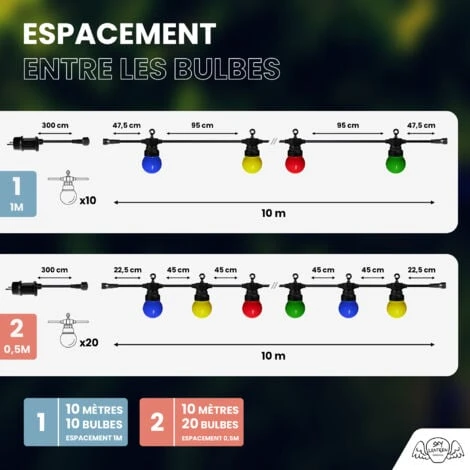 Créez le décor de vos rêves en choisissant d’installer la guirlande lumineuse guinguette bulbes multicolores seule ou en la raccordant à quelques compléments de guirlande guinguette blanche, multicolore ou transparente SkyLantern ! Afin de brancher votre complément, vous devrez d’abord retirer le bouchon présent sur l’embout de la guirlande guinguette en le dévissant dans le sens inverse des aiguilles d’une montre. Les crochets présents au-dessus des bulbes vous faciliteront la vie pour l’installation de la guirlande. Enfin, il vous suffit de raccorder la guirlande au transformateur et de brancher celui-ci. Si besoin, vous pouvez également utiliser le câble rallonge pour un branchement plus simple.