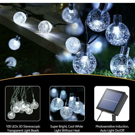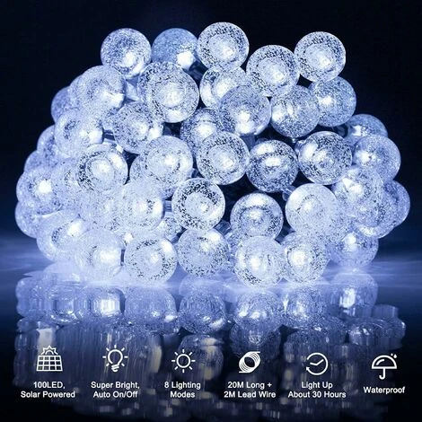 200 LED Guirlande Lumineuse Solaire: cette solaire boule guirlande mesure 22m (longueur de la guirlande lumineuse: 20m + câble de connexion: 2m) avec 2 00 LED lumineuses. Avec un panneau solaire, entièrement alimentés par la lumière du soleil, ils sont