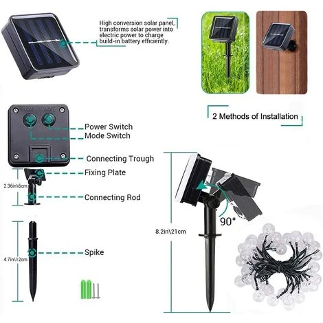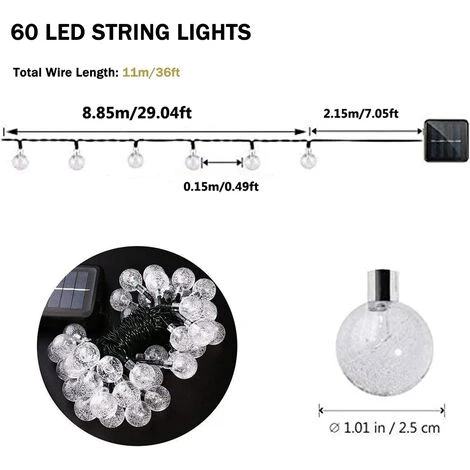 - 11M 60 LED Guirlande Solaire – Cette Guirlande Lumineuse avec 60 cristal boules, chaque boule est espacé de 15 cm pour un total de guirlande de 11 mètres (inclure le câble d’alimentation 2 mètres). Diamètre de chaque boule: 2,5 cm.