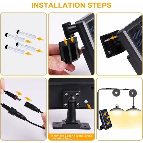 L’installation de lampes solaires et de panneau. Pas besoin de câblage supplémentaire, avec l’aide du pilote, vous pouvez installer le panneau solaire très rapidement sur le mur et ensuite les câbles de connexion. Il ne faut pas l’installer sur le mur, en fonction de vos besoins. Lorsque le panneau solaire a besoin de charger l’énergie solaire, vous pouvez le déterminer du stand.Il suffit juste d’avoir une petite patience. Vous serez conscient après avoir vérifié nos vidéos et photos.