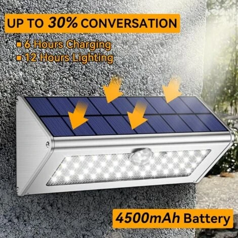 Ultra lumineux et longue durée : grâce à de nombreuses LED de haute qualité et à une puissante batterie Li-ion de 4500 mAh, le projecteur solaire sans fil peut éclairer facilement jusqu’à 60 mètres carrés. La plage de détection est de 5 à 10 mètres et l’angle de détection est de 120°.