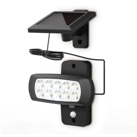- La lampe solaire d’extérieur en deux parties se compose d’un panneau solaire et d’un spot. Les deux composants sont reliés par un câble de 2,5 m résistant aux intempéries. Vous pouvez ainsi orienter le capteur solaire de manière optimale vers le soleil, indépendamment du projecteur, et l’utiliser à l’extérieur.