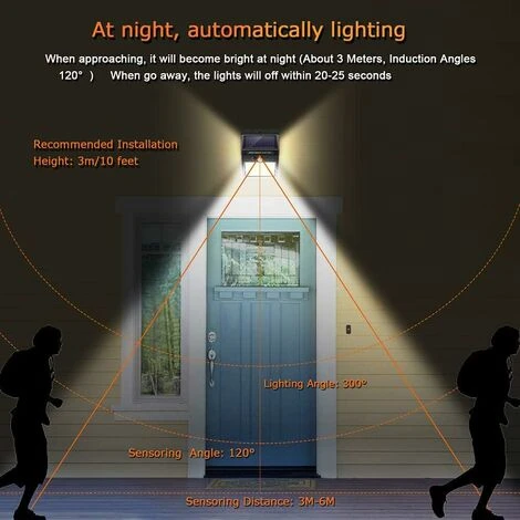 - ?Applique solaire étanche avec 3 surfaces lumineuses? Les lampes d’extérieur solaires ont 3 surfaces lumineuses avec lesquelles l’angle d’éclairage peut atteindre 300Ḟ. L’environnement est plus lumineux et plus sûr Le capteur de mouvement PIR mis à jour détecte les personnes à une distance de 10 à 19 pieds pour répondre à vos besoins. Et nous offrons une garantie de 24 mois.