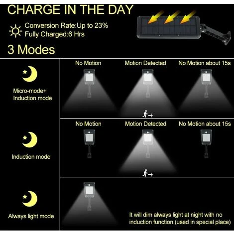 ★ Super Brightness: chaque projecteur contient 48 perles de LED à haute luminosité, 20 lumens par grain de LED. La luminosité maximale est de 960 lumens. Brillant la nuit et ne jamais sombre encore. Si vous souhaitez ajuster la tête de la lampe ou les panneaux solaires, veuillez ajuster l’interrupteur à vis à côté de la tête de la lampe, il sera facile d’ajuster la lampe,Évitez d’endommager la lampe