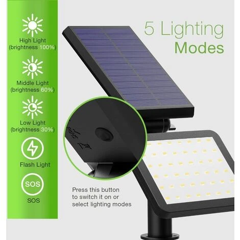 ★ Super Brightness: chaque projecteur contient 48 perles de LED à haute luminosité, 20 lumens par grain de LED. La luminosité maximale est de 960 lumens. Brillant la nuit et ne jamais sombre encore. Si vous souhaitez ajuster la tête de la lampe ou les panneaux solaires, veuillez ajuster l’interrupteur à vis à côté de la tête de la lampe, il sera facile d’ajuster la lampe,Évitez d’endommager la lampe
