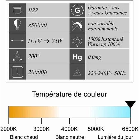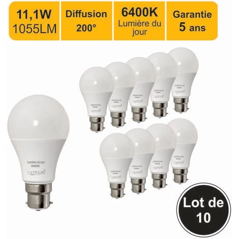 Lot de 10 ampoules LED B22 11,1W (equiv. 75W) 1055Lm 6400K