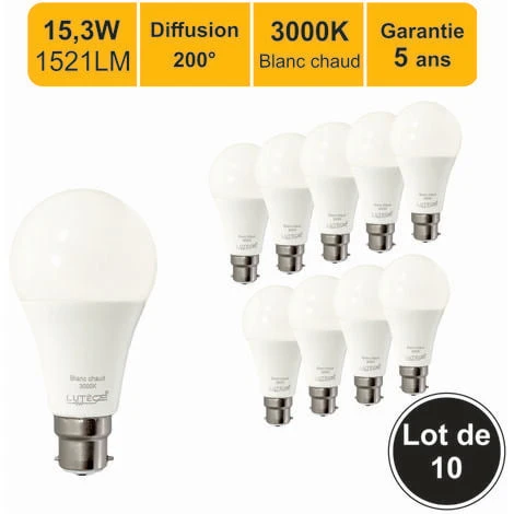 Lot de 10 ampoules LED standard A65 B22 15,3W (equiv. 100W) 1521Lm 3000K