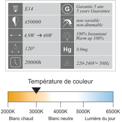 - Il s’agit d’ampoules LED non réglables, non compatibles avec les variateurs de lumière.