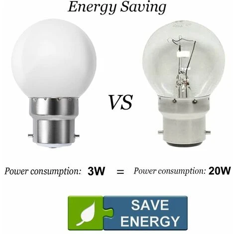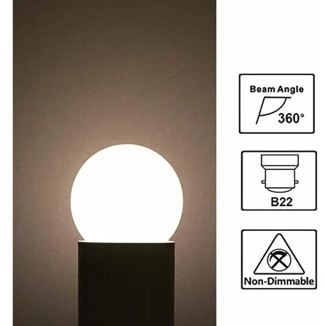 Économie d’énergie : vous pouvez économiser de l’énergie en utilisant des ampoules LED 3W G45 B22 au lieu d’ampoules à incandescence 20 W Lumière chaude et agréable, faible consommation énergétique, angle d’éclairage : 360 degrés.