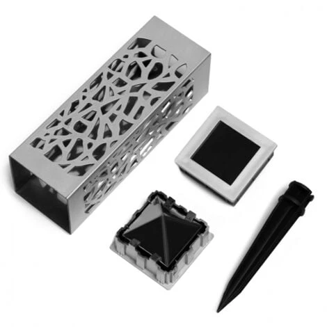 Descriptif du lot de 10 lampes solaires MOLLYQu’elles soient plantées dans votre jardin ou simplement le long de votre terrasse, ces 10 bornes solaires seront du plus bel effet ! Avec leur design ajouré moderne, vous pourrez illuminer vos extérieurs en un rien de temps. Chaque face des lampes est ajourée de manière à projeter une lumière façon ombres chinoises pour une atmosphère tout en douceur. Vos extérieurs seront donc illuminés et cela avec goût et modernité. Ce lot de 10 lampes ajourées est un élément de décoration incontournable pour votre jardin ! Facile à positionner, disposez-les en bordure de terrasse grâce aux piquets fournis et profitez d’une ambiance agréable et tendance. Équipées d’un panneau solaire intégré, les lampes solaires s’illumineront automatiquement dès la tombée de la nuit : ambiance chaleureuse garantie !Dimensions du lot de 10 lampes solaires MOLLY- Dimensions hors tout : Longueur 6 cm x largeur 6 cm x Hauteur (avec piquet) 29 cm- Hauteur d’un piquet : 11 cm- Dimensions du panneau solaire : 4 x 4 cm- Structure en plastique- Couleur argentée- Lampes solaires à planter- Batterie solaire – Fonctionne avec piles rechargeables AA – NiMH – 1.2V – 100 mAh- Panneau solaire 2V – 35 mAh- LED blanche