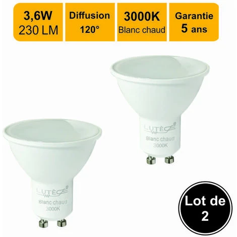 Lot de 2 ampoules LED spot GU10 3.6W (equiv. 25W) 230Lm 3000K