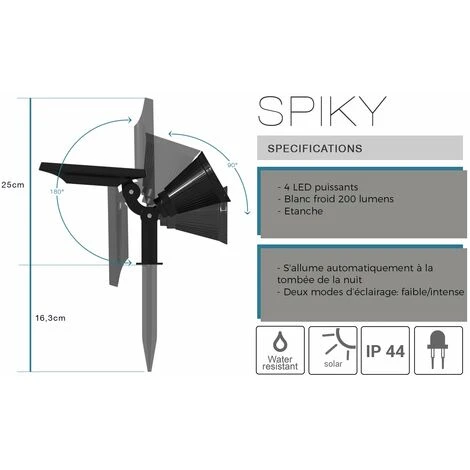 INTENSITÉ : le lot de spots solaires 2x Spiky W34 possède une luminosité blanc froid à intensité variable. Ces lampes solaires sont un bel éclairage puissant avec leur flux lumineux de plus de 100 Lumens.