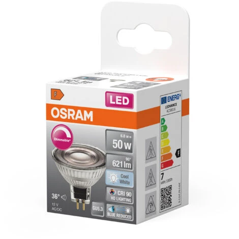 Lampes LED gradables à réflecteur MR16 avec culot à broches, lumière du jour. Caractéristiques produit: Alternative LED aux lampes traditionnelles 12 V. Gradable. Culot : GU5.3. Indice de rendu des couleurs Ra: ≥ 90. Lampe en verre. Avantages produits: Remplacement rapide, simple et sûr sans recâblage. Conception, dimensions, flux lumineux comparables à une lampe halogène. Spectre de la lumière naturelle avec un excellent rendu des couleurs​ (IRC >90). Réduction significative de la lumière bleue. Meilleur confort visuel et réduction de la fatigue. Faibles coûts de maintenance et économies de coûts grâce à une longue durée de vie. Effets de scintillement et stroboscopiques réduits. Domaines d’application: Commerces et salles d’exposition. Applications domestiques. Applications commerciales. Éclairage d’accentuation. Outdoor use in suitable outdoor luminaires only.