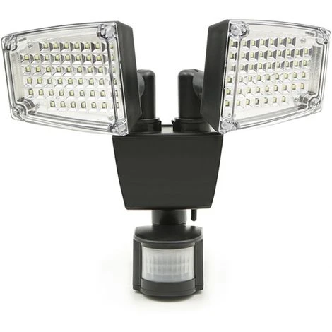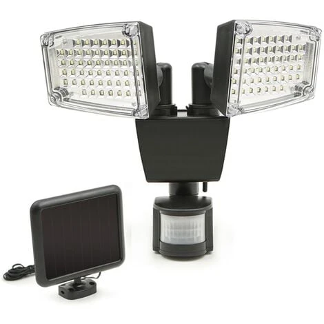 Eclairer de manière efficace un endroit reculé sans électricité est désormais possible grâce à ce projecteur solaire 2 têtes 100 led avec son capteur solaire déporté et son détecteur de présence grand angle.Un abri de jardin, une dépendance située dans le fond du jardin, au-dessus de votre porte de garage : cette lampe d’extérieur en ABS+polycarbonate est équipée de 2 têtes pour 2 fois plus de possibilités !Pratique sans fil, il s’installe où vous le souhaitez avec sa large base et ses 2 têtes pivotantes de haut en bas et de façon latérale. Vous éclairez sur une longue portée où vous le souhaitez. Ce projecteur intelligent s’adapte à tous vos besoins.Son détecteur de présence à 180° s’allume au moindre mouvement sur une portée allant jusqu’à 12 m avec une durée d’éclairage de 3 à 7 minutes.3 réglages disponibles :1er bouton : distance de détection : de 2 à 12M (ajustable)2e bouton : Temps d’éclairage : de 5 s à 5 min (ajustable)3e bouton : intensité : de 10 à 2000 LUX (ajustable)Ecologiques, ses 100 led blanches puissantes sont alimentées par un panneau solaire déporté (Dim. 16,4 x 13,5 cm) collectant l’énergie pendant toute la journée. Il s’allume automatiquement dès la tombée de la nuit au moindre passage. Autonomie : 6 à 8 h.Indice de protection IP44 certifié pour résister aux intempéries.Puissance: 12 W avec batterie solaire en lithium rechargeable : 6V – 1.2W (Batterie 2200 mAh 3.7V 1PK)Flux lumineux : environ 1100 lumens.Dimensions du projecteur : 23,5 x 29 x 13 cm en ABS + PC coloris noir.Système de fixation murale inclus.Conforme aux normes CE / EMC / RoHS en vigueur.Existe en modèle 3 têtes 178 led