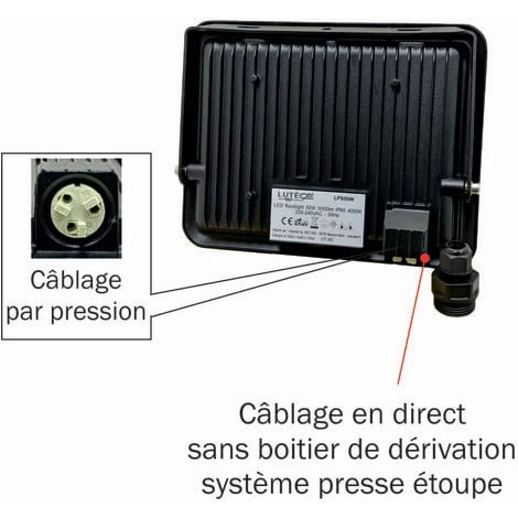 Afin de garantir la meilleure étanchéité, la connexion au réseau électrique est automatique et directe. Vous n’aurez pas besoin d’utiliser des dominos ou des boites de dérivation. Aucun câble n’est fourni avec ce projecteur.
