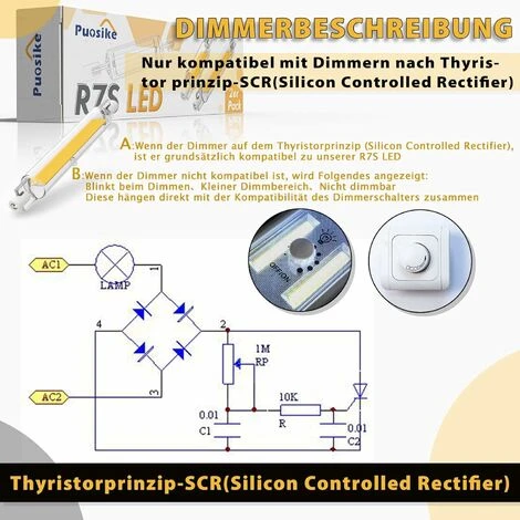 💡【Description Gradateur】R7S LED 118mm Prend charge gradation, mais uniquement compatible avec les gradateurs basés principe thyristor SCR (Silicon Controlled Rectifier). Remarque : si le gradateur n’est pas compatible, clignotera lorsqu’il sera atténué