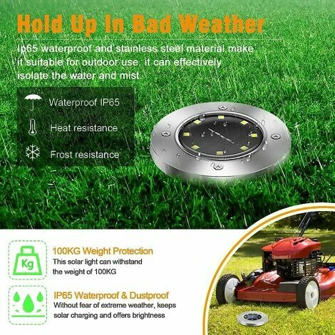���【Étanche & Durable】La lampe solaires au sol est en acier inoxydable et en plastique de haute qualité. Il a un niveau d’étanchéité professionnel IP65 et est très approprié pour une utilisation en extérieur. Il peut isoler efficacement le brouillard d’eau et a une durée de vie plus longue. Il peut être utilisé par tous les temps, comme la pluie, la neige, le gel ou le grésil. De plus, la spot solaire exterieur en acier inoxydable peut supporter une charge de 200kg.