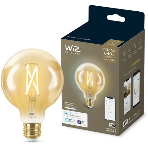 Cette ampoule sphérique WiZ connectée à filament avec un revêtement ambré apporte une touche vintage à vos lampes et luminaires. Utilisez l’application WiZ ou votre voix pour varier l’intensité lumineuse ou appliquer des modes d’éclairage prédéfinis sur les configurations Wi-Fi.